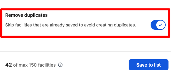 - This allows users to easily avoid adding in duplicate addresses/sites into separate lists within the dashboard. Makes prospecting even more powerful, easy, and automated without having the need to go back and ensure you don’t have duplicate facilities appearing within Prospecting tool results.