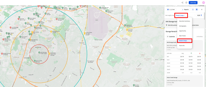 - Select Rental Comps to instantly see trailing 12-month rental rates for nearby facilities.