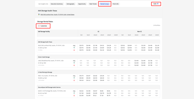 - Rental Comps Tab – average, minimum, and maximum prices for each comp; facility name, address, square footage, distance, and pricing data.